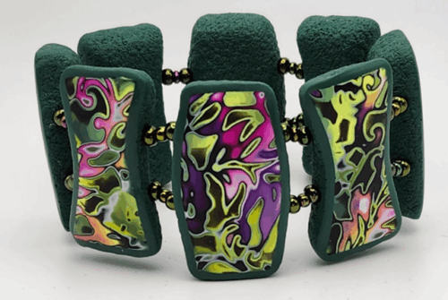 - Create a surface design of some sort… mokumé gane, alcohol ink designs, infused glitters. You can cut out inchie squares from this slab where each one is different and each one is beautiful. Surface affects like imitation gem-stone. Anyone who has learned from Lindly Haunani’s books or tutorials might look back at her work for inspiration.